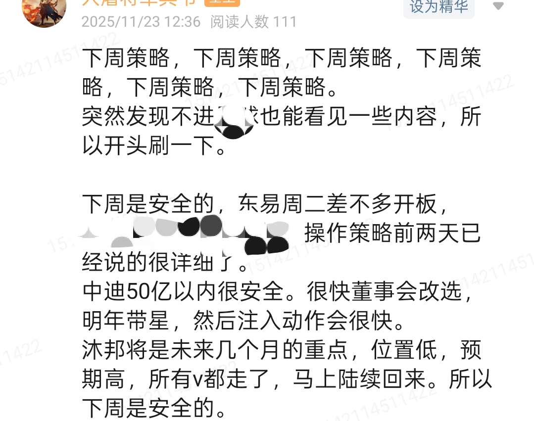 平时我是喜欢预判,喜欢马前炮的,只能说比大部分人准,做不到绝对的对,所以以后也会少预判,预判准了顶多夸一句,不准就会无数人来骂。之前预判东易周二开板。中迪50亿以内风险很小,沐邦超级安全和预期高。