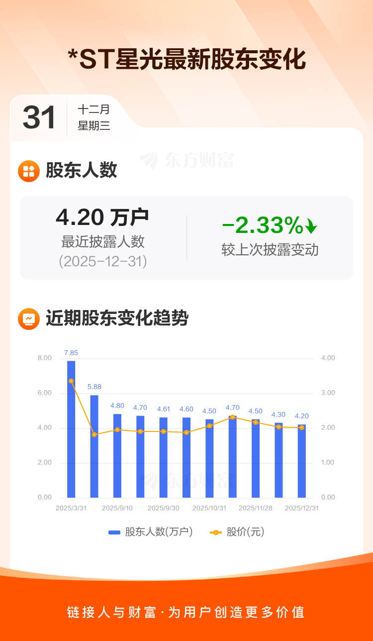 *ST星光最新披露数据显示,截至12月31日公司股东户数为4.20万户,较上期(2025年12月19日)减少1000户,降幅为2.33%。户均持有流通股数量由上期的2.42万股上升至2.48万股,户均持股金额由上期的4.92万元增加至4.99万元。
