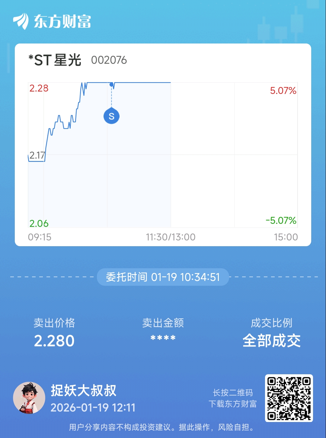 现在已经清仓了,留了个底仓!因为要过年了!回笼下资金,持有星光6年!晚上都睡不好