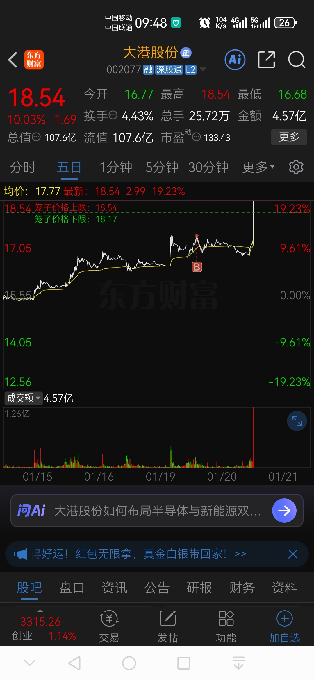 $大港股份(SZ002077)$ 昨天最高点买的,以为要套住了,还好今天涨停了。谢谢主力。