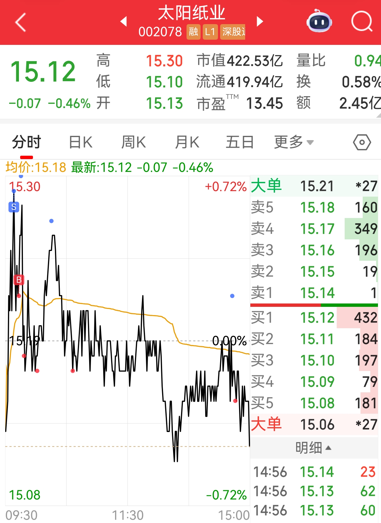 $太阳纸业(SZ002078)$ 完美,准备加仓到400-500手