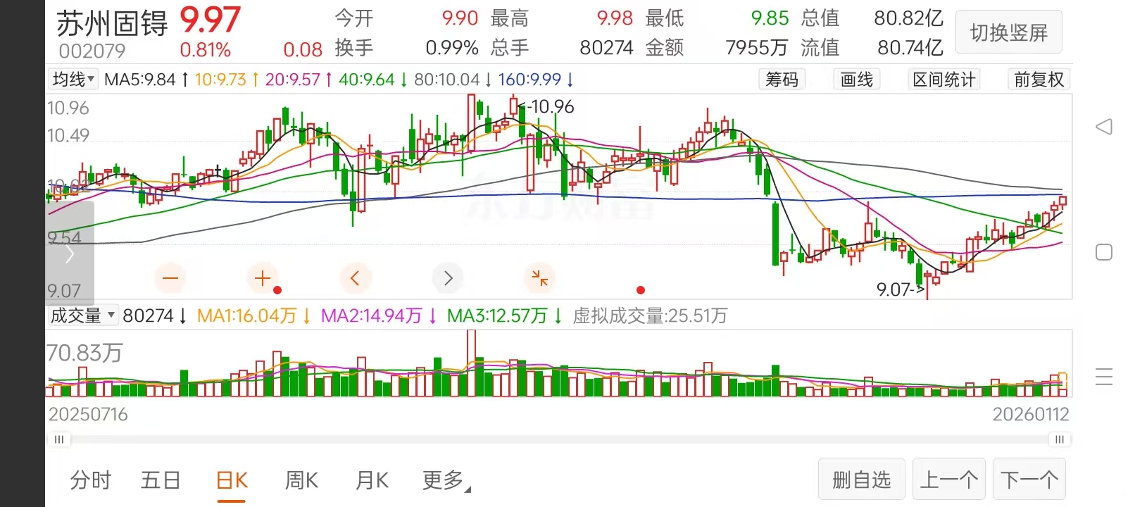 80日线10.03,上午最高10.02,又来到80日线面前。