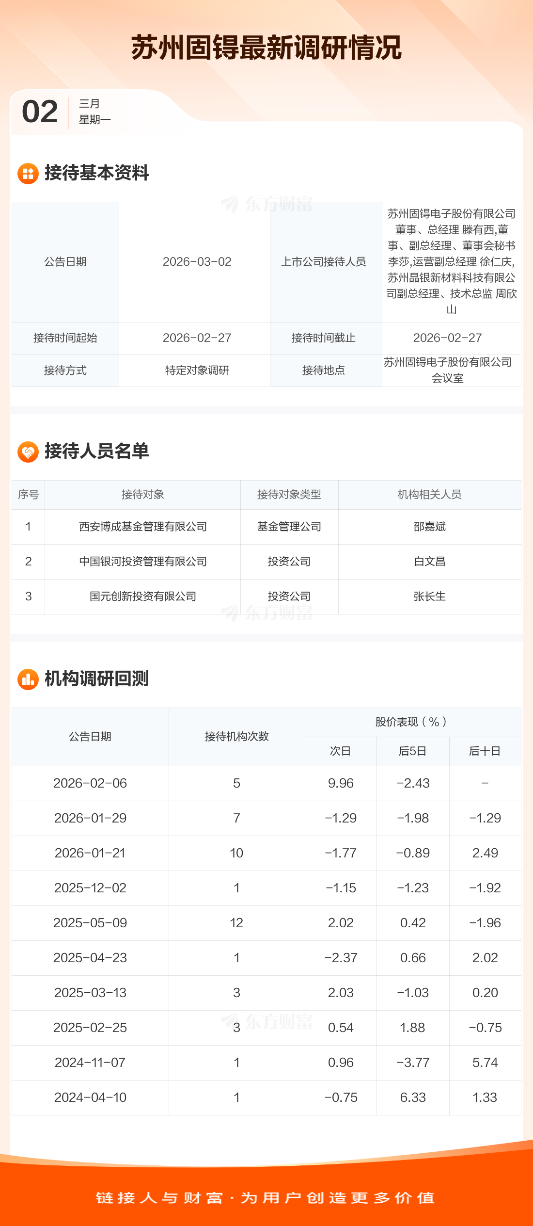 苏州固锝3月2日公告称,2月27日接待西安博成基金管理有限公司等3家机构调研。接待人员包括苏州固锝电子股份有限公司董事、总经理 滕有西,董事、副总经理、董事会秘书 李莎,运营副总经理 徐仁庆,苏州晶银新材料科技有限公司副总经理、技术总监 周欣山。
