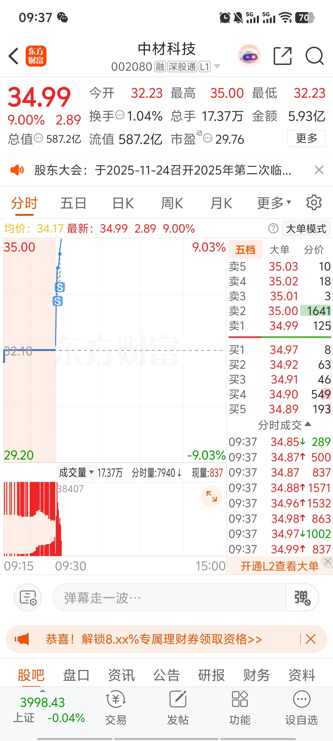 $中材科技(SZ002080)$ 走了,等不到涨停了