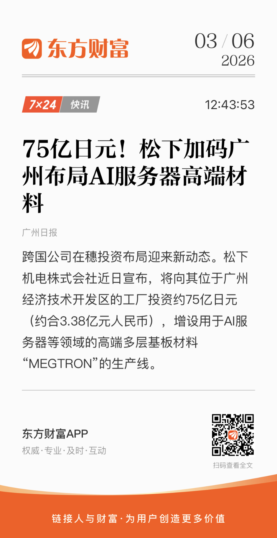 $中材科技(SZ002080)$ 松下加码广州布局AI服务器高端覆铜板。沪电股份:拟55亿元投建印制电路板及其配套设施项目。AI浪潮下电子布是长牛赛道。