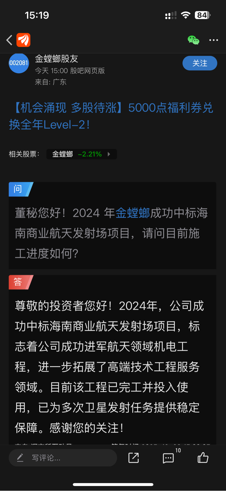 $金 螳 螂(SZ002081)$ 真阴险,收盘才回复。这家伙有商业航天概念。