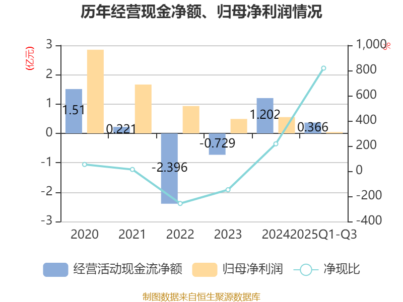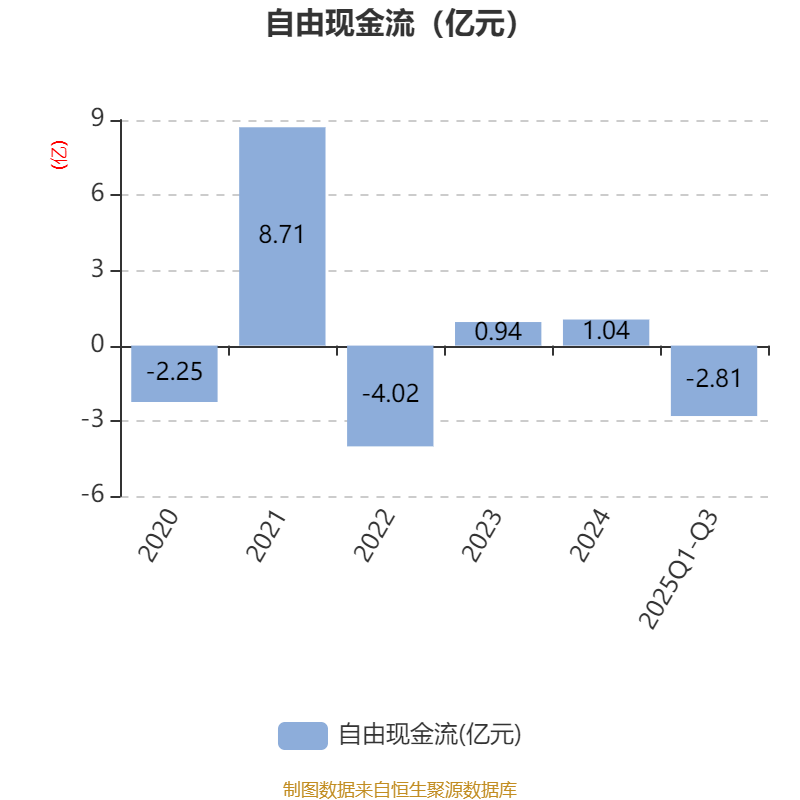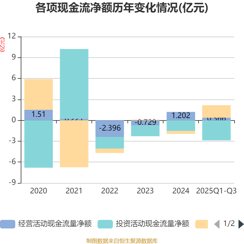 2025年前三季度,公司经营活动现金流净额为3657.3万元,同比下降73.15%;筹资活动现金流净额1.79亿元,同比增加2.66亿元;投资活动现金流净额-2.88亿元,上年同期为-1.93亿元。