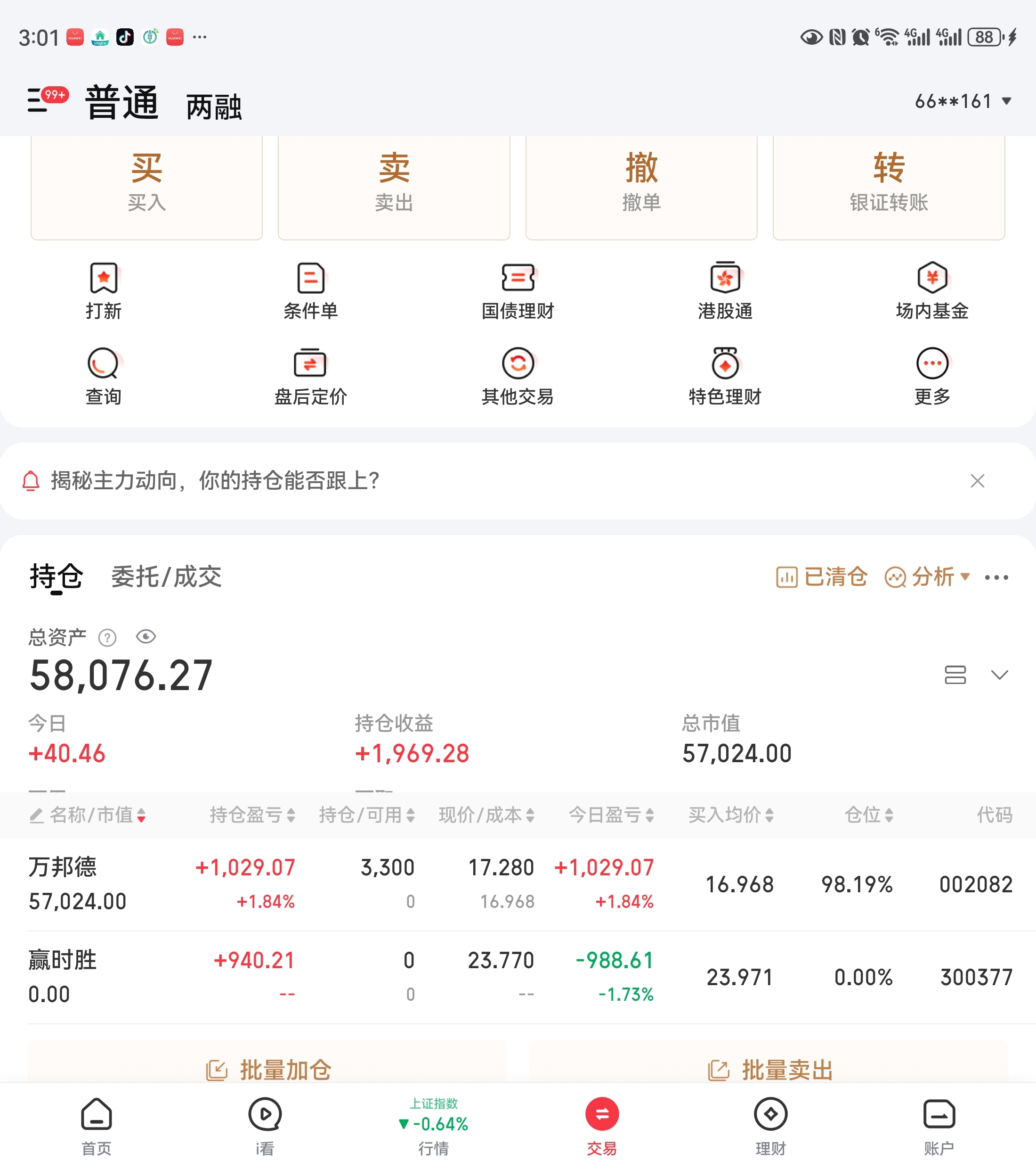 记录:1.13盈亏+40.46。操作:赢时胜水下-1.73%亏损全出;全仓万邦德