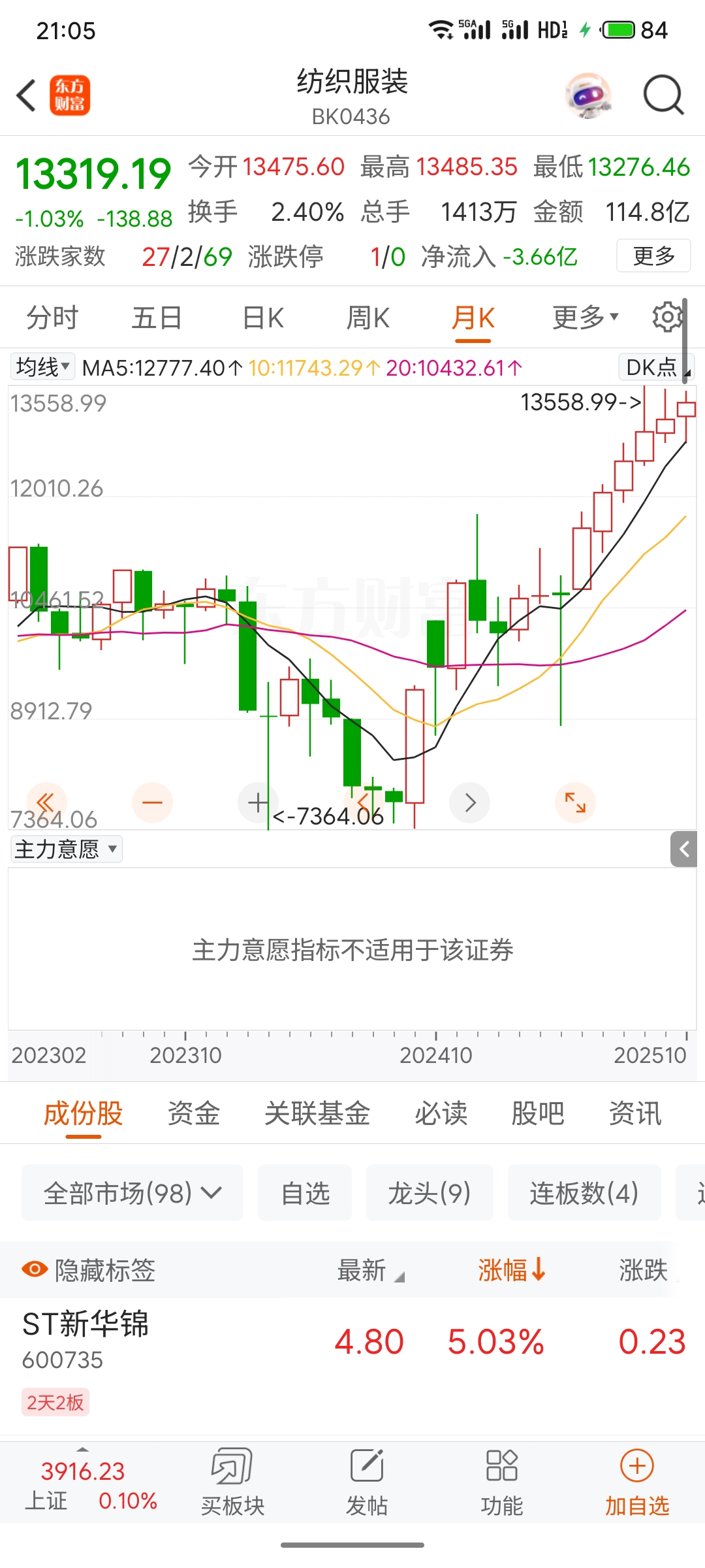 纺织板块已经快翻倍了,大家想想都板块跌的时候他会不会跟,还在等