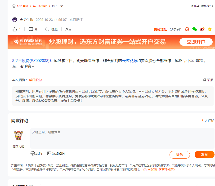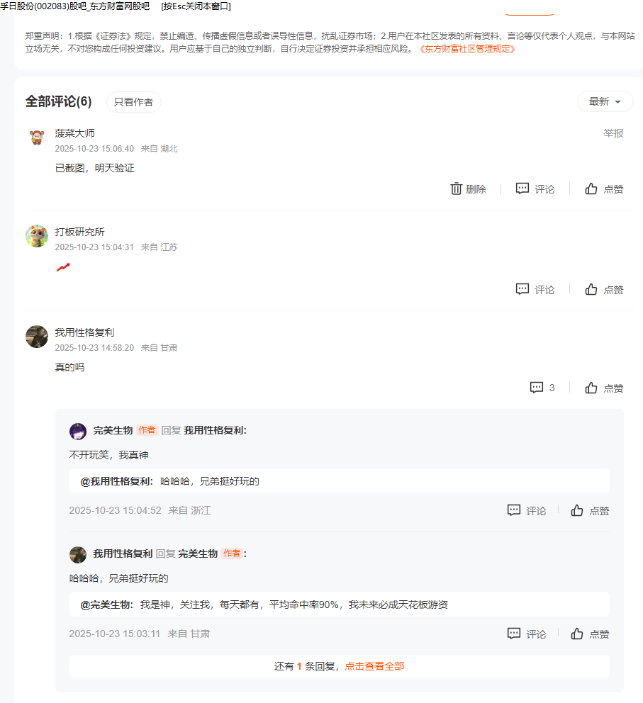 温馨提示: 1.根据《证券法》规定,禁止编造、传播虚假信息或者误导性信息,扰乱证券市场;2.用户在本社区发表的所有资料、言论等仅代表个人观点,与本网站立场无关,不对您构成任何投资建议。用户应基于自己的独立判断,自行决定证券投资并承担相应风险。《东方财富社区管理规定》