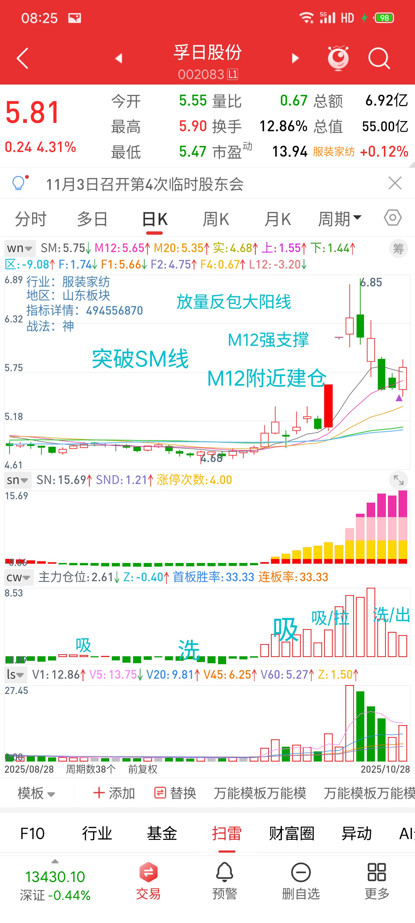 $孚日股份(SZ002083)$ 昨天放量反包大阳线,今天应该还会有行情。低吸即可或者在M12处建仓。