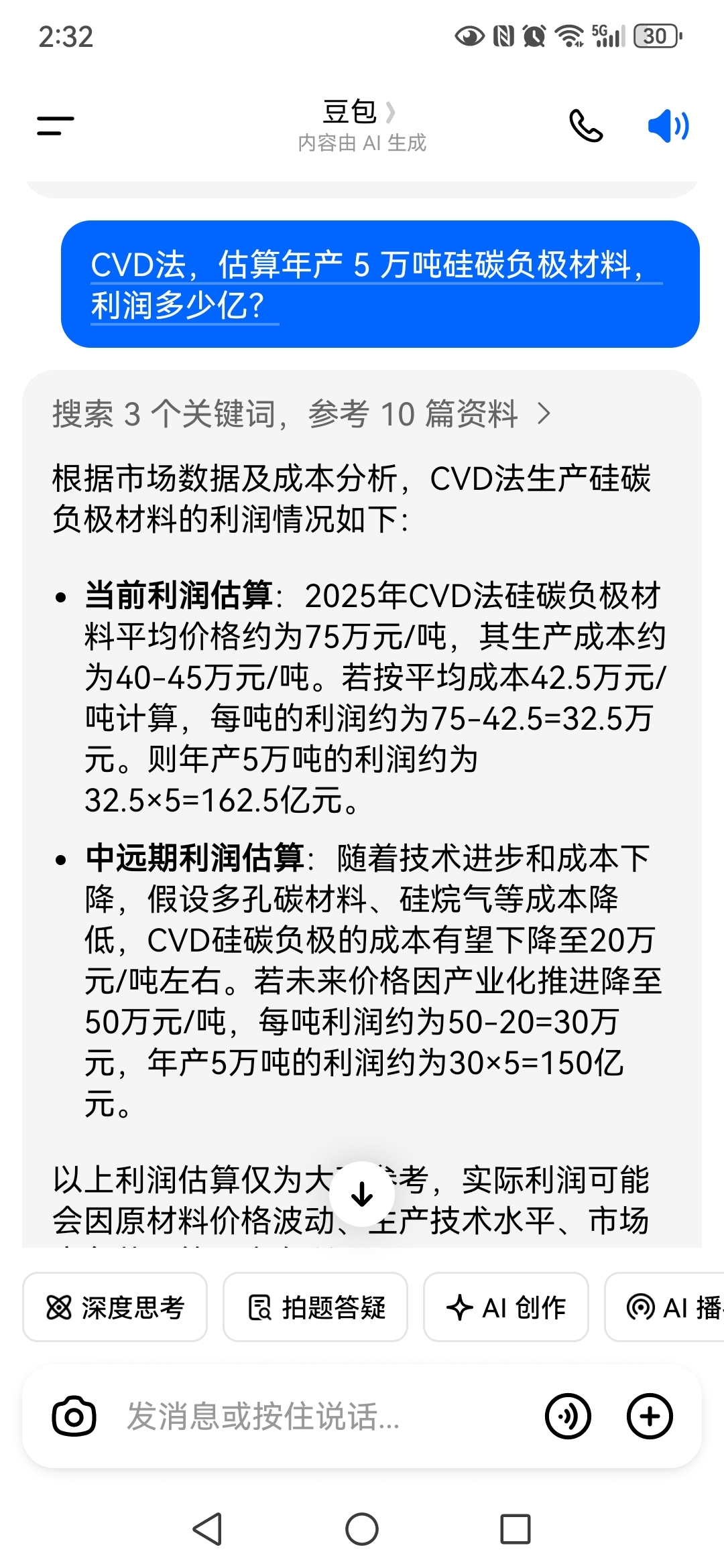 根据市场数据及成本分析,CVD法生产硅碳负极材料的利润情况如下: