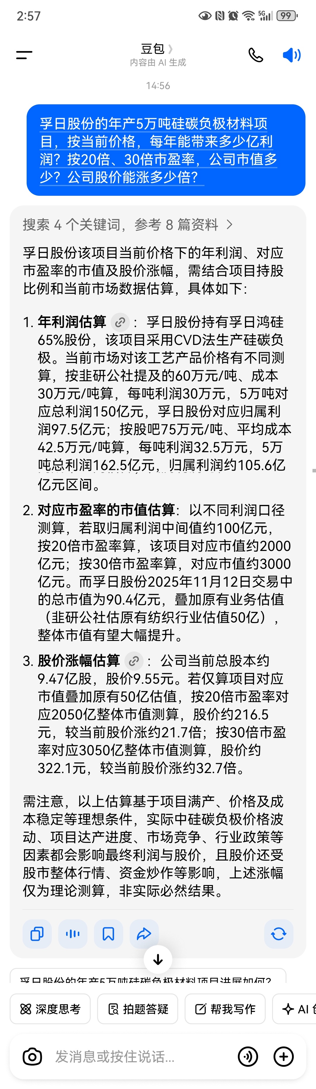 年产5万吨硅碳负极材料项目,带来利润约100亿,按20倍市盈率,市值2000亿,