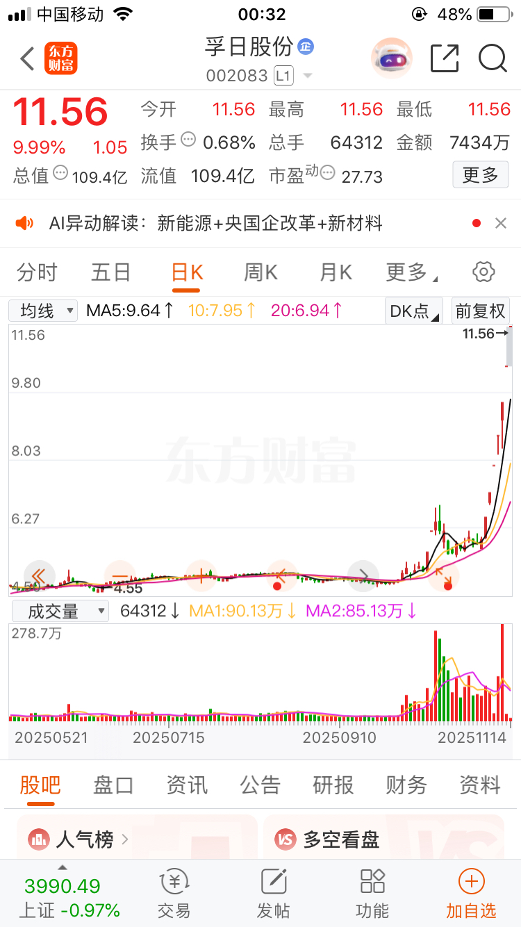 $孚日股份(SZ002083)$ 热度第一,浮日股份与孚日股份,两者意思是不是一样?孚日股份公司简介有这么一段:拥有国家级技术中心、实验室和博士后科研工作站,配套完备的中试基地及检测实验室,形成了强大的技术研发能力。不太清楚,但股价却涨疯了,周末信息满天飞,铺天盖地,情绪爆棚,很适合大资金在高位溢价倒仓。不关我事,隔岸看热闹。