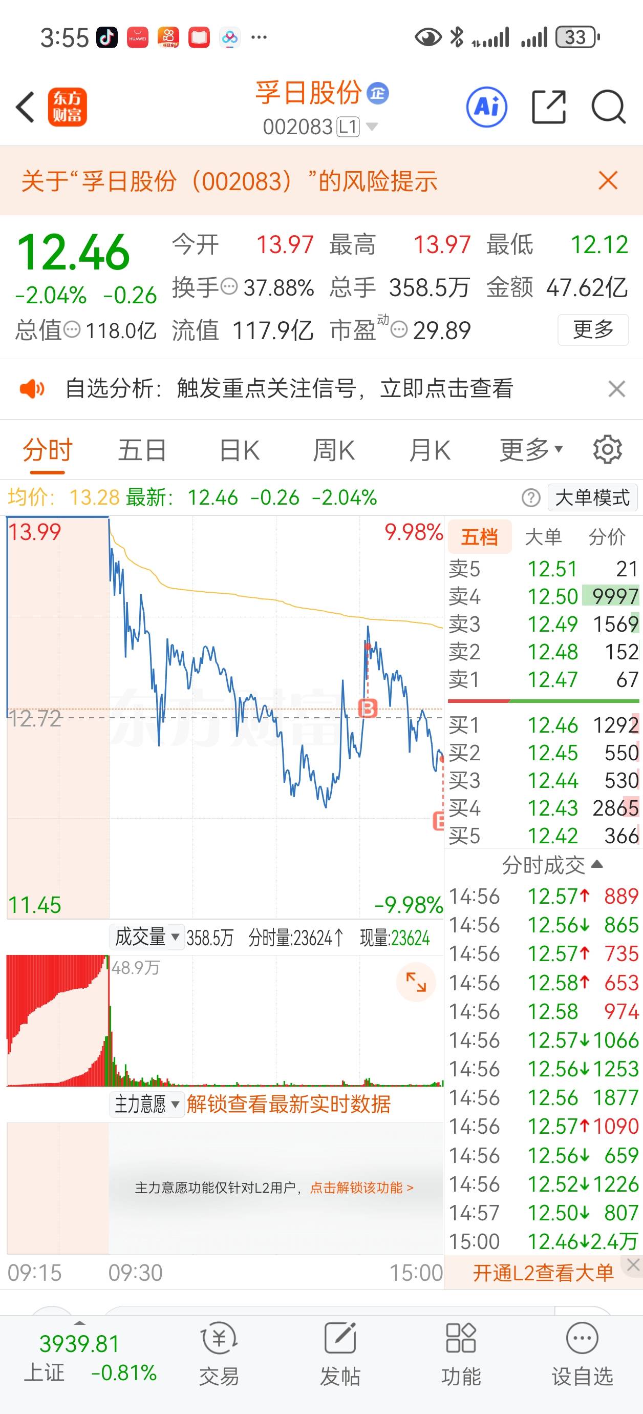 $孚日股份(SZ002083)$ 你孚日是龙头吗?不是吧。龙头是谁?是合富吧。你既然不是龙头,分歧没扛住你还能再弱转强吗?总市值118亿 成交了47.5亿,有40%不流通的,那么里面能卖的筹码基本都卖完了。今天开盘也就前5分钟有大单买入,后面全是散户接盘,因为他们认为龙头接首阴,可是他只是个跟风,为啥说跟风不是龙头呢?龙头有带动他没有,他还要别人带动。 下午幸福地天才把他带动反弹了一下。所以说他不是龙头。既然不是,又高位放天量,获利盘大多出逃了,高位又是散户接了大量筹码。那么明天获利盘还会再回来给散户们抬轿子吗?如果不来那就是地板开地板走了吗?