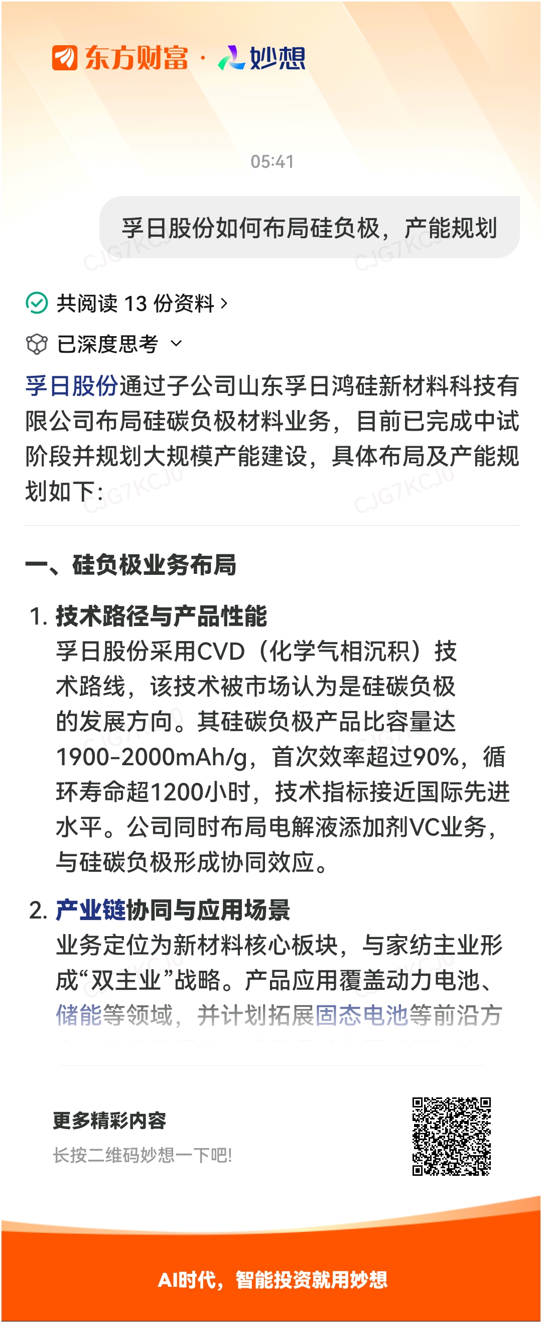 #@妙想,你怎么看?# 妙想一下:孚日股份如何布局硅负极,产能规划。孚日股份五万吨硅负极马上投产,产能规模行业第一$孚日股份(SZ002083)$ $多氟多(SZ002407)$ $龙蟠科技(SH603906)$
