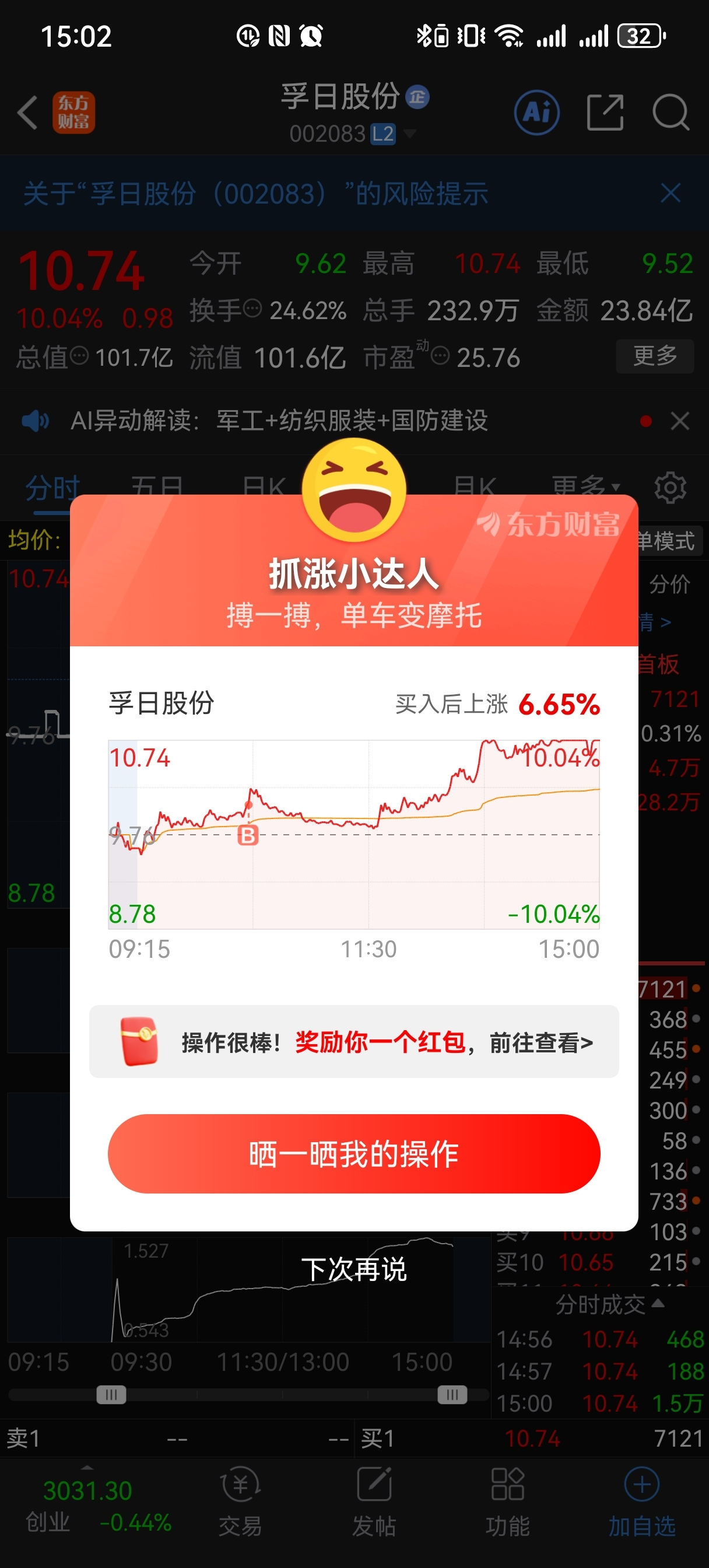 $孚日股份(SZ002083)$ 本来可以早点买的,就等全志科技,长多点卖掉,等了等去,忍不住了,2个多点卖掉了全志科技,买入孚日股份,一看买高了。没办法气的不看盘了,反正也买不了。尾盘一看给了惊喜。还好不是惊吓