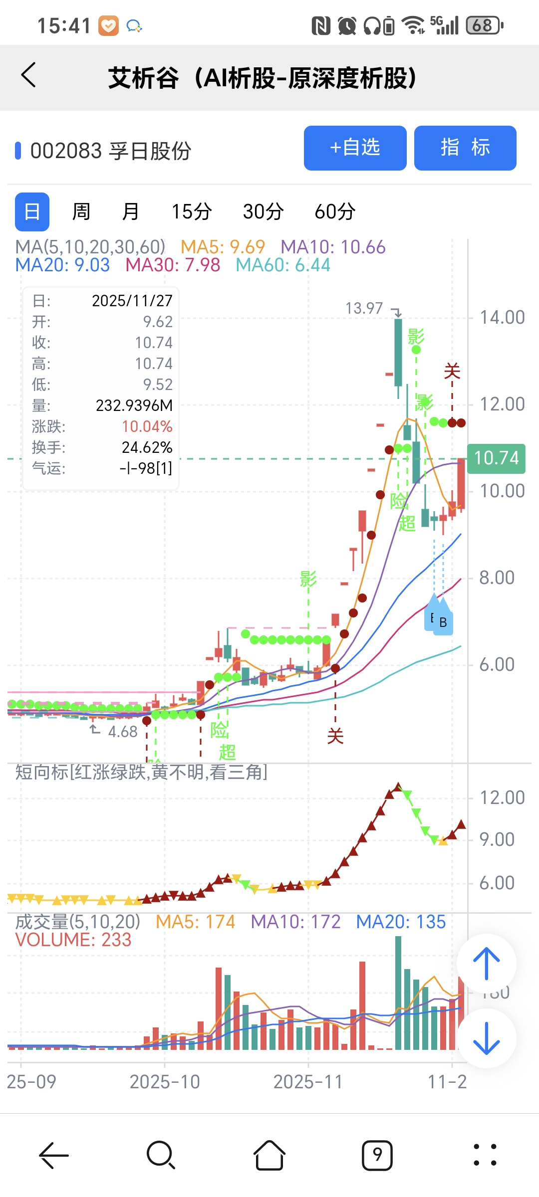 红绿小圆点是艾析谷的量化指标-超级短趋线,是趋势跟踪+突破类的量化指标,完全免费。