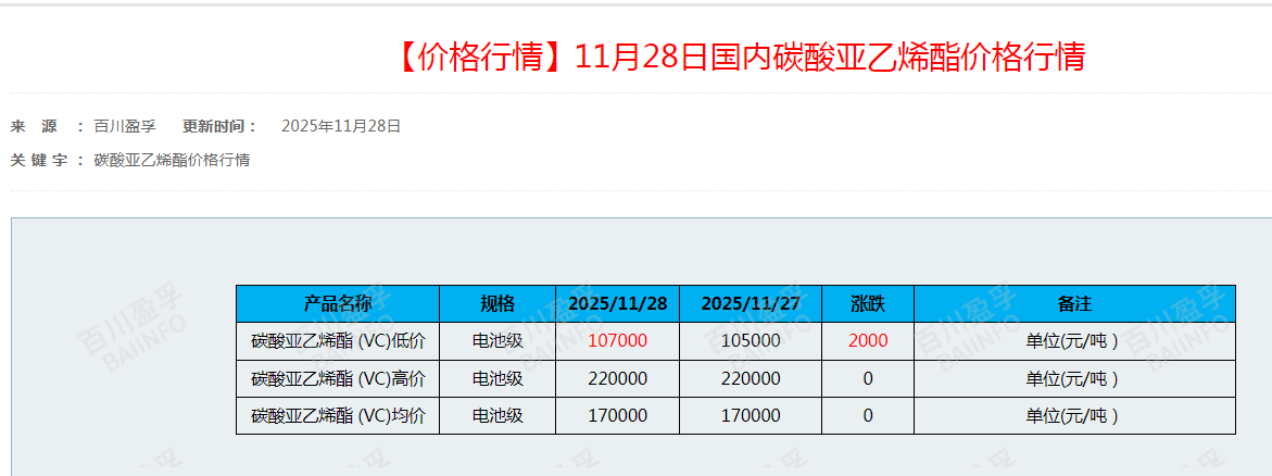 今天又涨价了 【价格行情】11月28日国内碳酸亚乙烯酯价格行情