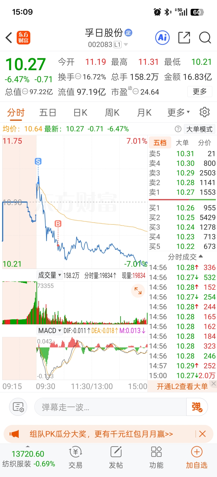 $孚日股份(SZ002083)$ 今天有没有大聪明和我一样的操作?昨天尾盘买的,早盘清空后,又低吸了一口,说实话,这票收成这个样子,是完全没有想到的。破了五周均线,头疼啊,现在锁住的利润只有0.6,也不知道够不够周一低开的,计划周一破新低立即清仓。
