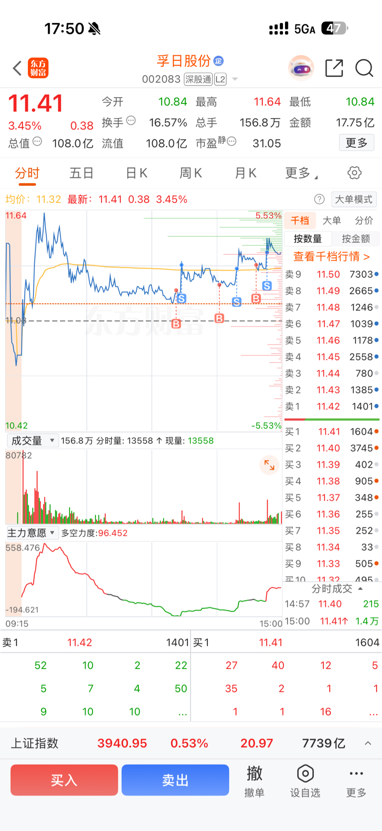 $孚日股份(SZ002083)$ 下午拉升明天早盘肯定要低开,压低价格,前30分钟11.15左右可以买,挂11.55走,后面11.80,12,12.25,涨停价,全挂好
