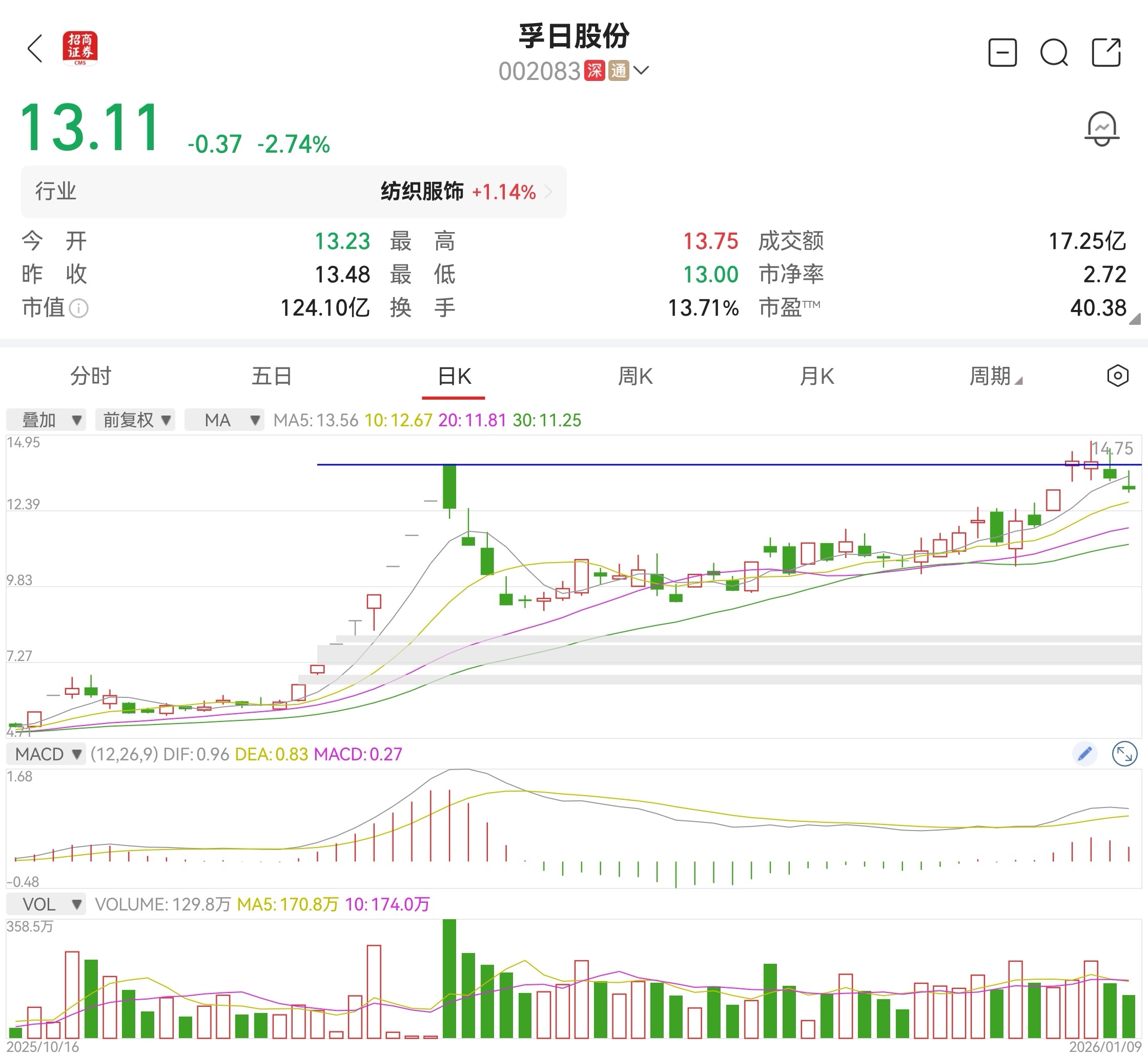 $孚日股份(SZ002083)$基本面扎实,技术上可以按七伤拳来操作,今天是1月5日涨停后调整第五日,明天是最后的低吸机会。冲破13.97元是大概率事件,主升开启,耐心等待!