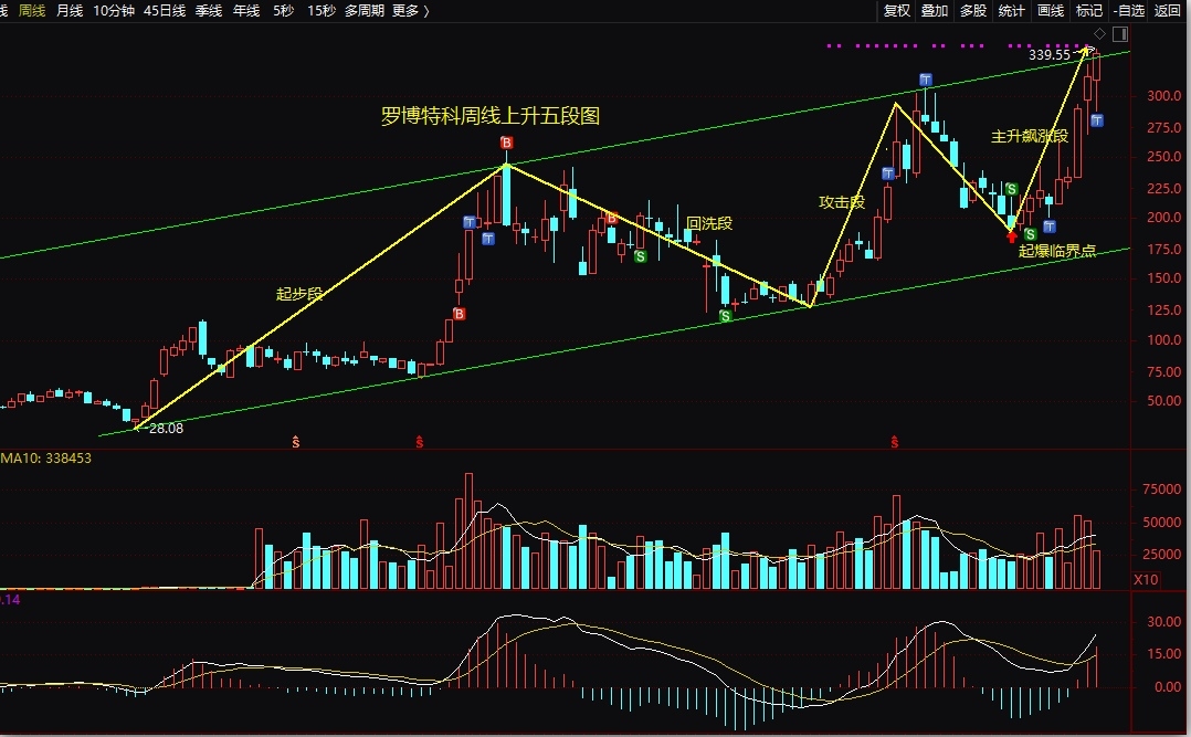 前面的帖子用箱体理论给了萝卜第一波的上涨高点307元附近,正如所预判那样萝卜最高来到306.68元。现在给大家发一张日线箱体图和周线上升五段图,并大体预计一下萝卜突破后可能的走势。按箱体理论我给萝卜两个箱体的目标位,看第一箱体位的力度来决定未来走势,分别是379元和451元。