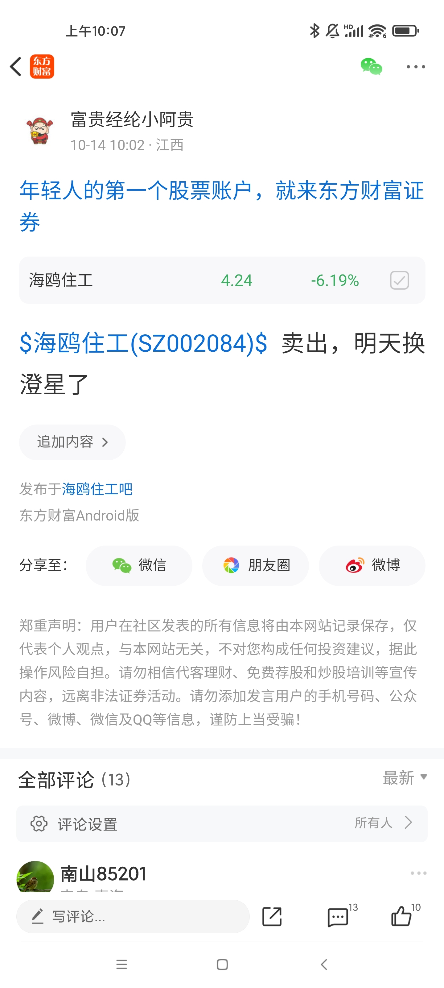 温馨提示: 1.根据《证券法》规定,禁止编造、传播虚假信息或者误导性信息,扰乱证券市场;2.用户在本社区发表的所有资料、言论等仅代表个人观点,与本网站立场无关,不对您构成任何投资建议。用户应基于自己的独立判断,自行决定证券投资并承担相应风险。《东方财富社区管理规定》