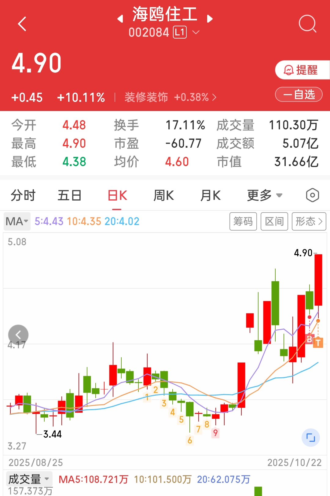 $海鸥住工(SZ002084)$ 十月份第九个涨停板