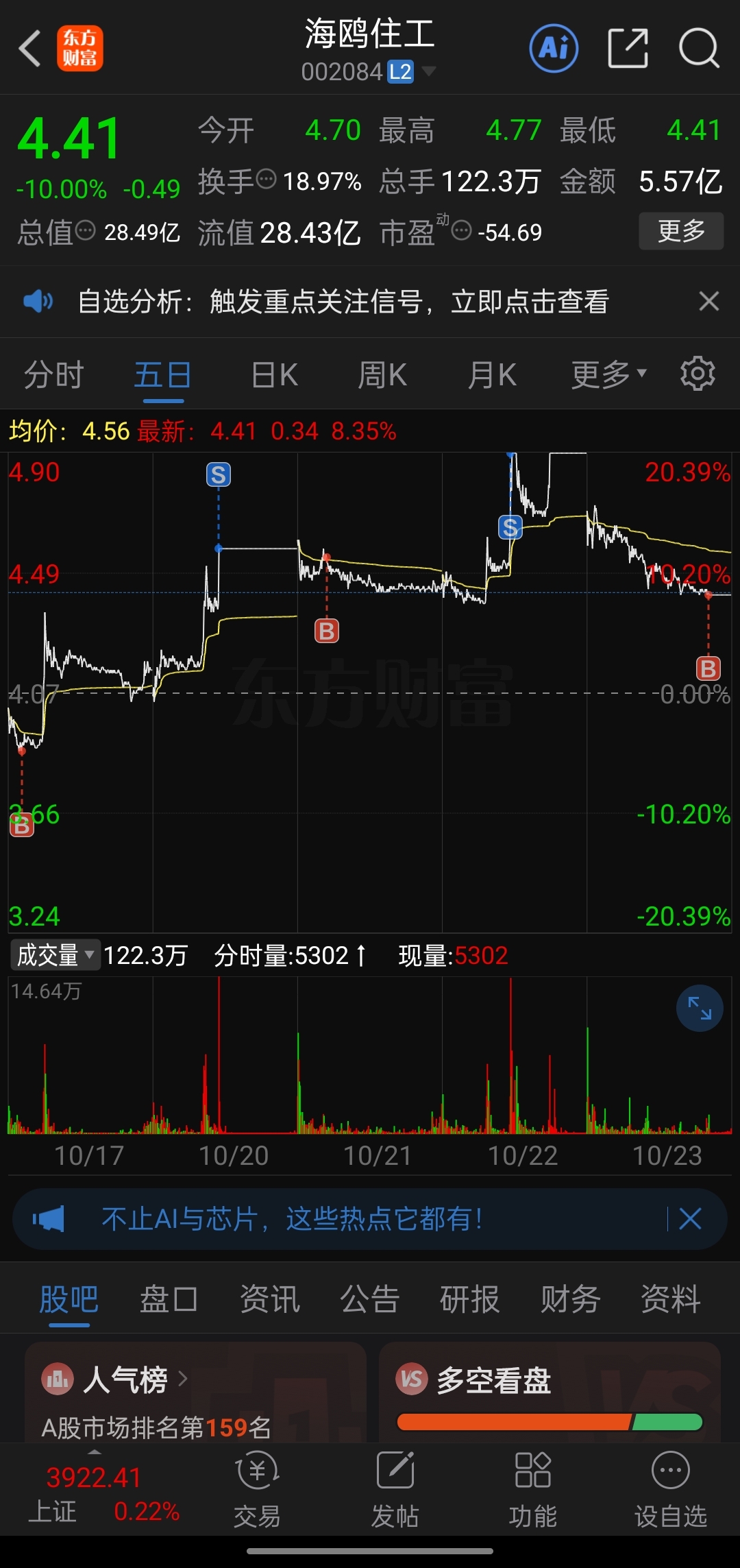 $海鸥住工(SZ002084)$ 看这走势本来是想着明天入的,尾盘居然给我跌停,先入手准备跟着上楼梯了