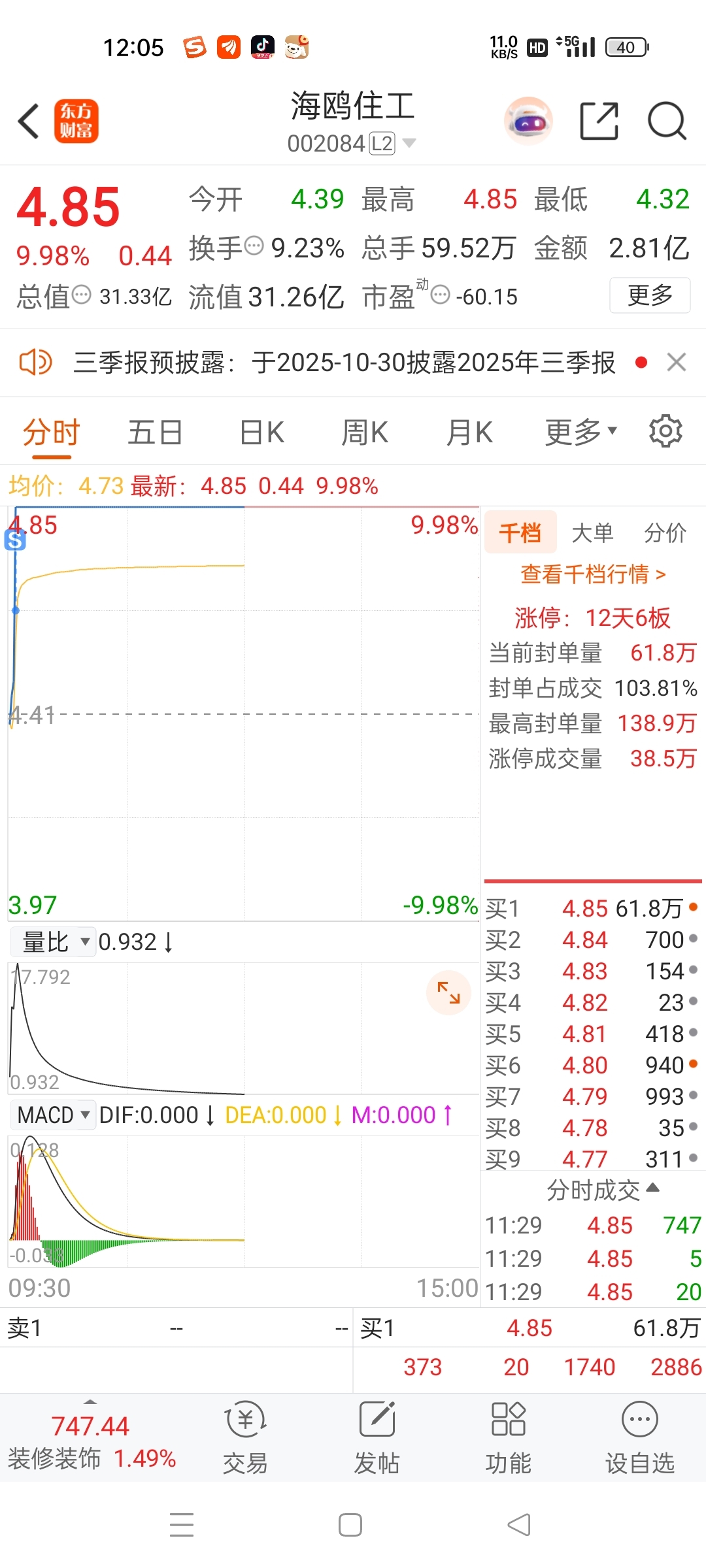 $海鸥住工(SZ002084)$ 又卖亏了,卖出就10秒钟涨停,这么精准吗?4.65又亏了,