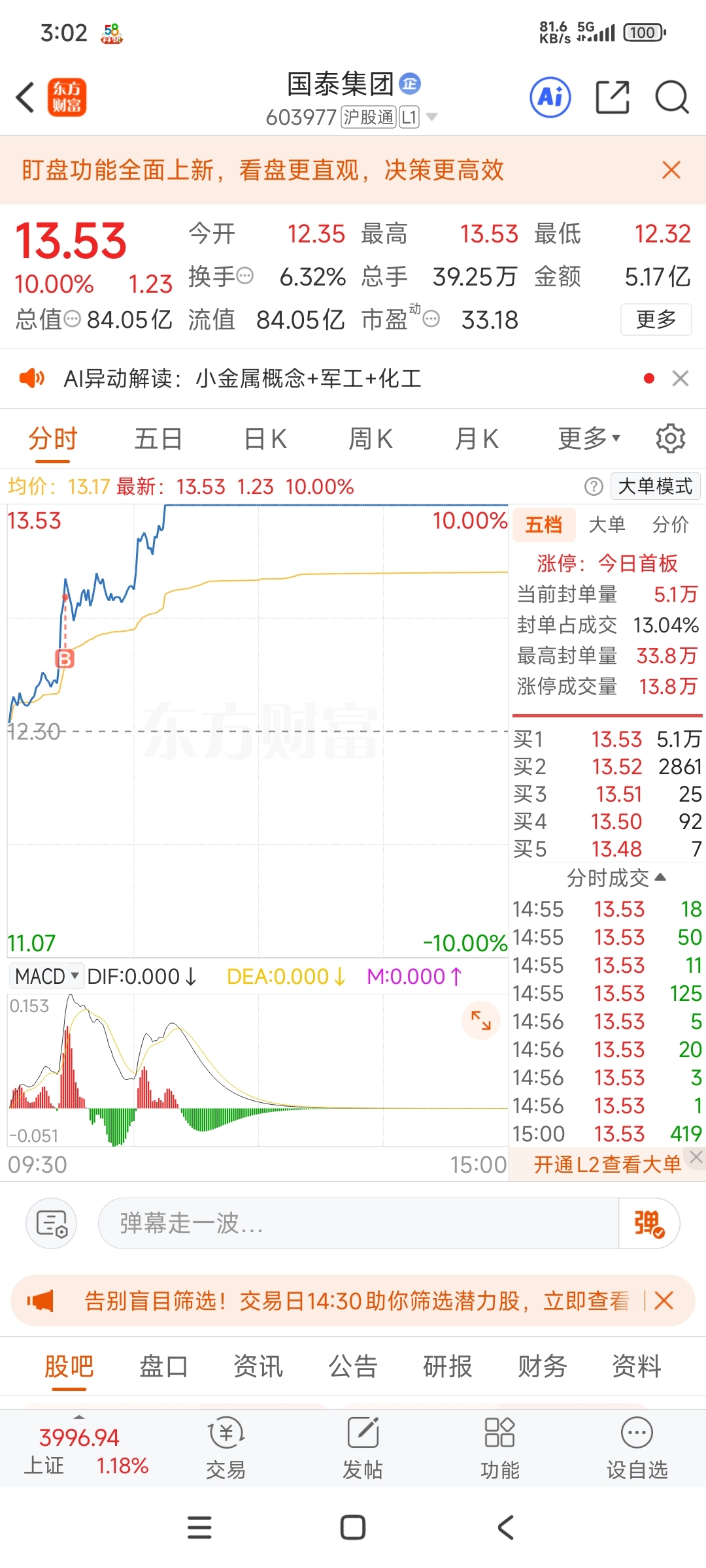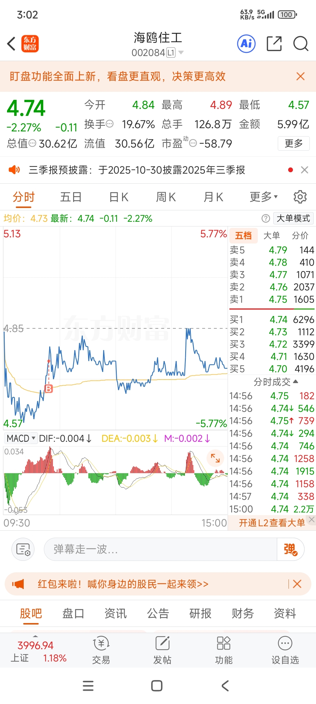 $海鸥住工(SZ002084)$ #复盘记录# 今日复盘:中国核建水下开盘,被吓出来了。小赚清仓离场。今日资金均分建仓四支股票,海鸥今天想着能收个红盘,但是几次拉升都上不去。悦达早上竞价涨停,想着可以回封,但是今天一直中规中矩。国泰今天符合预期,大连想着也就四五个点,没想到涨停了,给了我一个惊喜。