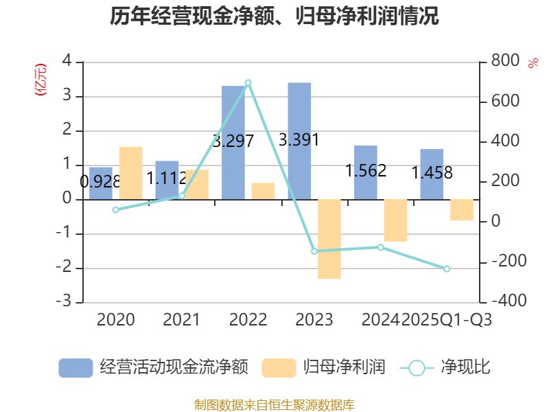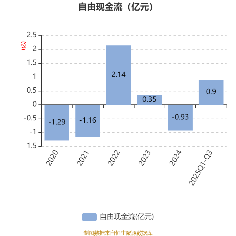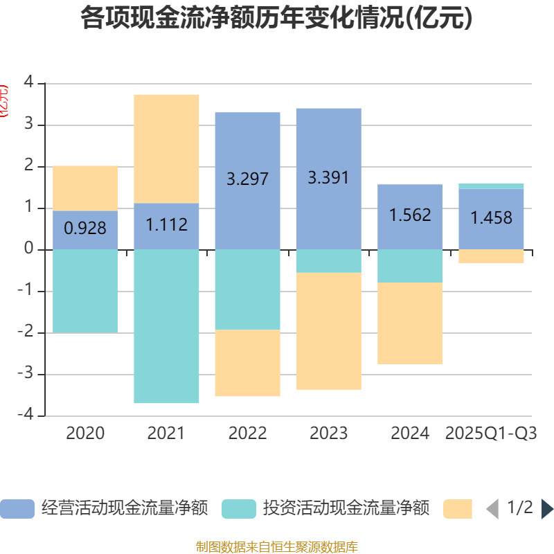 2025年前三季度,公司经营活动现金流净额为1.46亿元,同比增长5.36%;筹资活动现金流净额-3342.81万元,同比减少8057.48万元;投资活动现金流净额1256.36万元,上年同期为-5029.75万元。