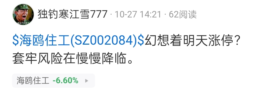 $海鸥住工(SZ002084)$ 当天看kdj指标的顶背离,想到了会下跌,但没想到会来得这么快杀得这么猛。参与者难受吧?