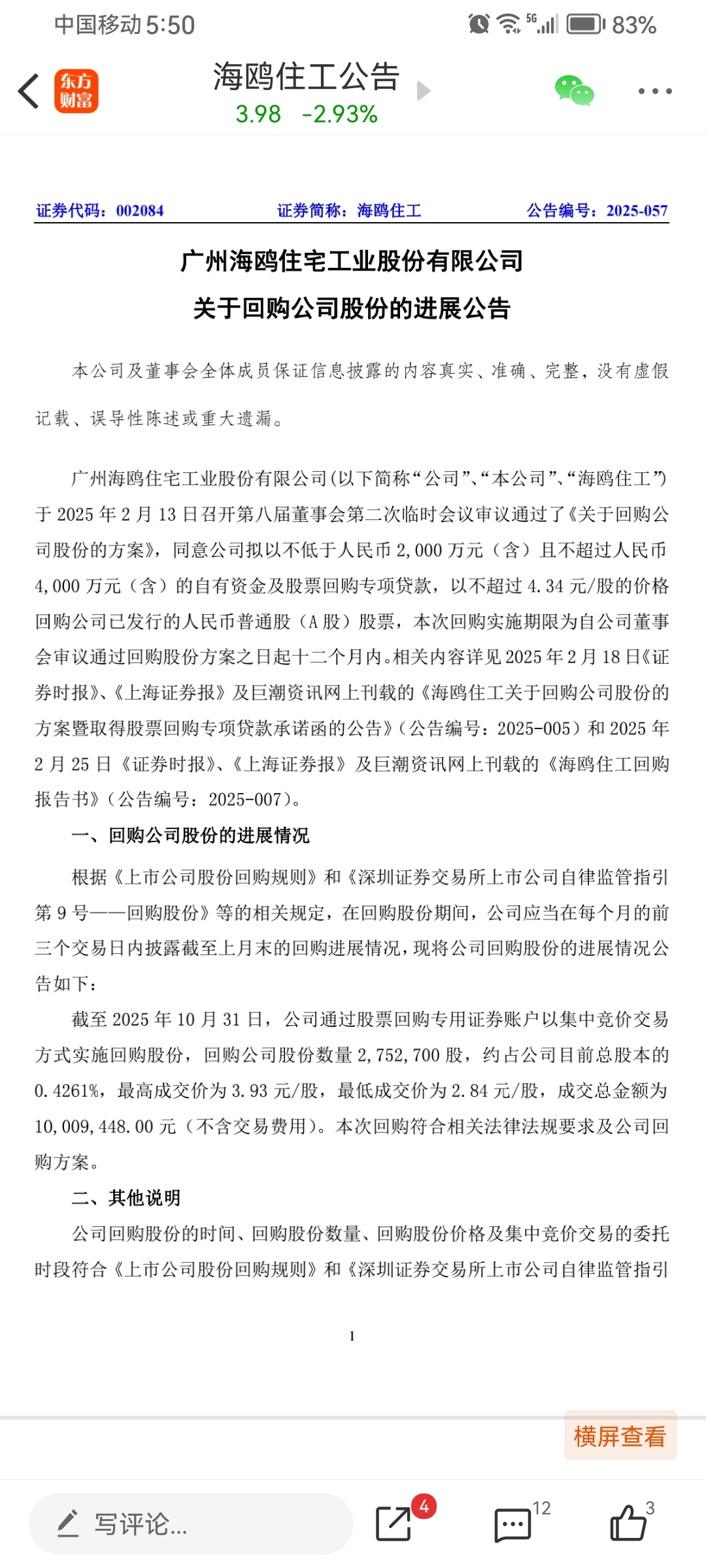 $海鸥住工(SZ002084)$ 大家自己去算回购均价3.64元,还有一个跌停。。。如果公司能在120日线马上完成回购,不再拖拉就算是恩赐了。。。