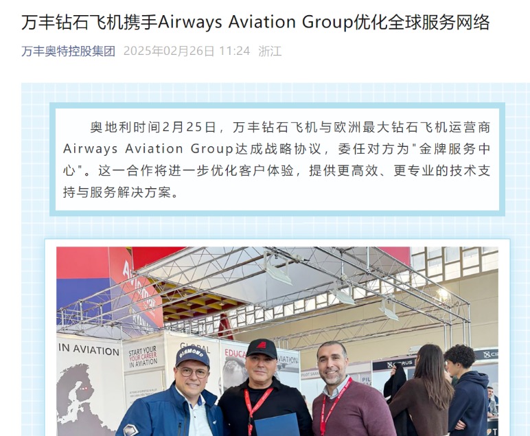 万丰钻石飞机携手Airways Aviation Group优化全球服务网络