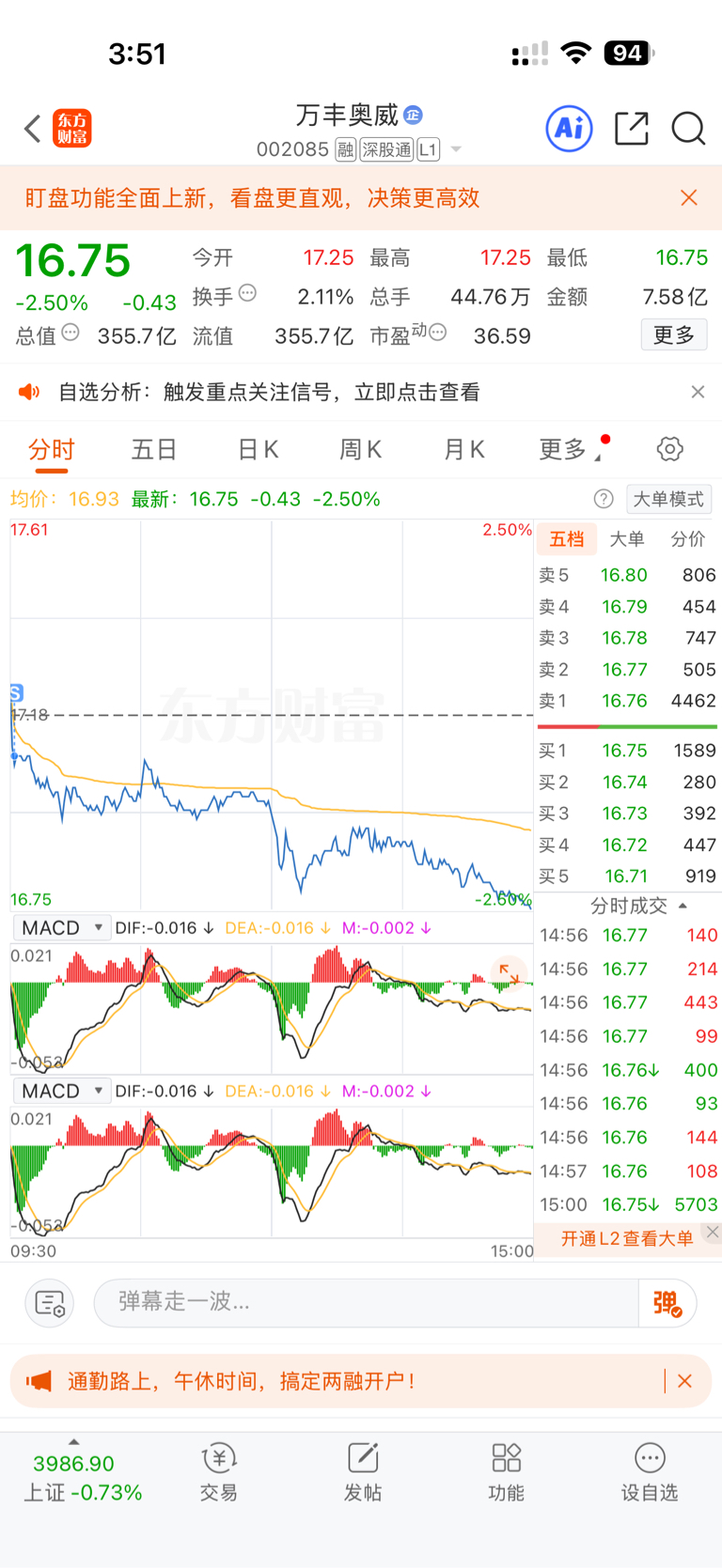 $万丰奥威(SZ002085)$ 兄弟们,我昨天梭哈的,今天成本价卖了,不能陪伴大家。伤不起