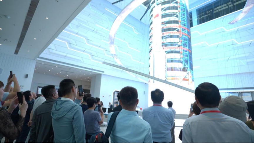 参会嘉宾在文昌航天超算中心观看模拟火箭发射
