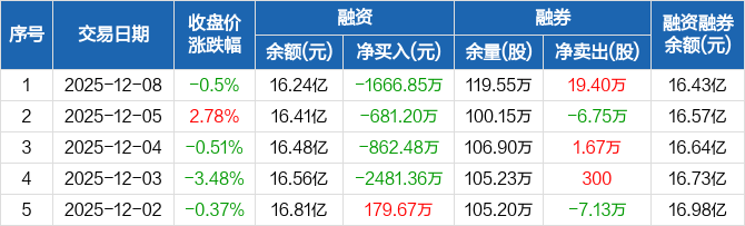 融资方面,当日融资买入5072.73万元,融资偿还6739.58万元,融资净偿还1666.85万元,连续4日净偿还累计5691.89万元。融券方面,融券卖出19.5万股,融券偿还1000股,融券余量119.55万股,融券余额1891.27万元。融资融券余额合计16.43亿元。