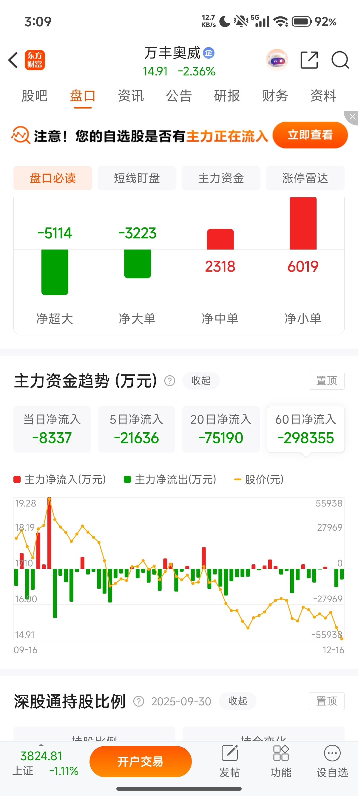 $万丰奥威(SZ002085)$ 六十天,主力净跑了三十亿,这还是明牌数据,加暗盘估计至少有五十亿,配合百年人寿清仓式减持,减持金额高达四十亿元,这一波不知道要套22万散户多久,无意唱空,我就十手底仓,观察了七八天,应该也不会买了,万丰的观察到此结束,仅个人意见,不喜勿喷!