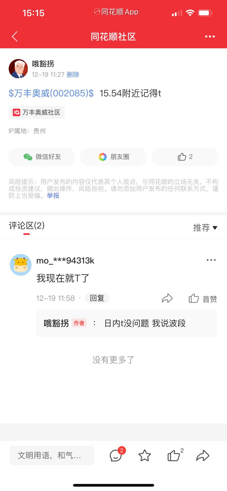 $万丰奥威(SZ002085)$ $万丰奥威(002085)$ 我说的15.54今天差一分钱,都做t了吗?不放量就观望哦不要随便操作,14.8附近是机会。
