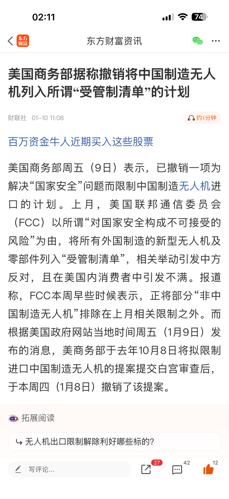 $万丰奥威(SZ002085)$ 周末最大的利好是美解除对华无人机出口限制!