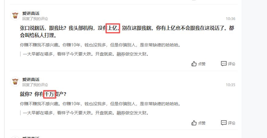 爱讲真话啊,你昨天还说自己账户是100万出头呢,今天一下子变成上亿了?真就吹牛不