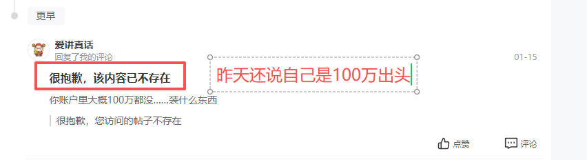 爱讲真话啊,你昨天还说自己账户是100万出头呢,今天一下子变成上亿了?真就吹牛不上税啊。你要是不心虚,删什么贴,拉什么黑啊。