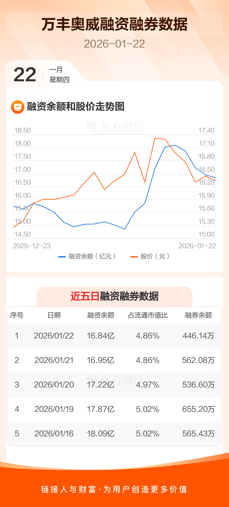 交易所最新数据显示,万丰奥威于2026年1月22日获融资买入7232.48万元,融资偿还8355.16万元,当日融资净偿还1122.67万元。目前,该股融资余额16.84亿,占流通市值比例为4.86%。