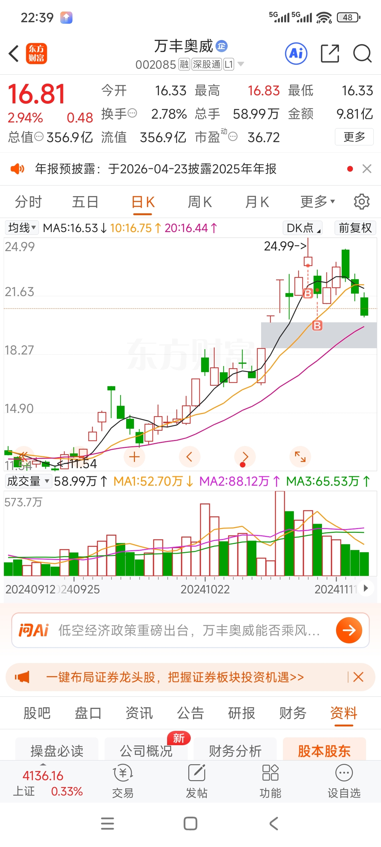 这个股自24年以24的价格买入以来,拿了一年多,可谓是个中酸苦,唯有自知。好在万丰集团和陈总在此期间也没有减持,应该确实也是想把企业做好,希望早点能迎来低空领域的黄金发展期。