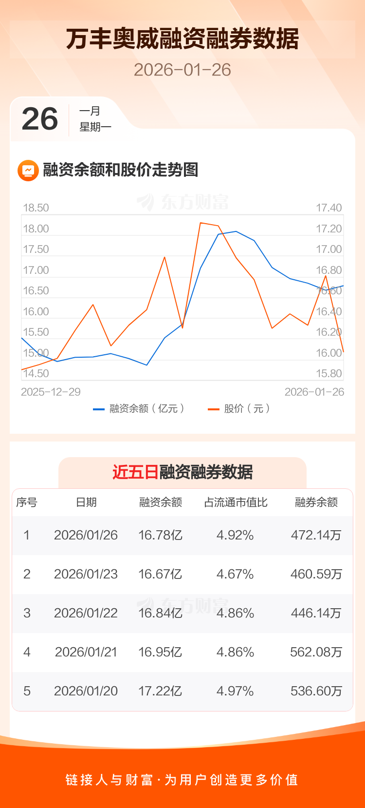 交易所最新数据显示,万丰奥威于2026年1月26日获融资买入1.21亿元,融资偿还1.10亿元,当日融资净买入1082.01万元。目前,该股融资余额16.78亿,占流通市值比例为4.92%。