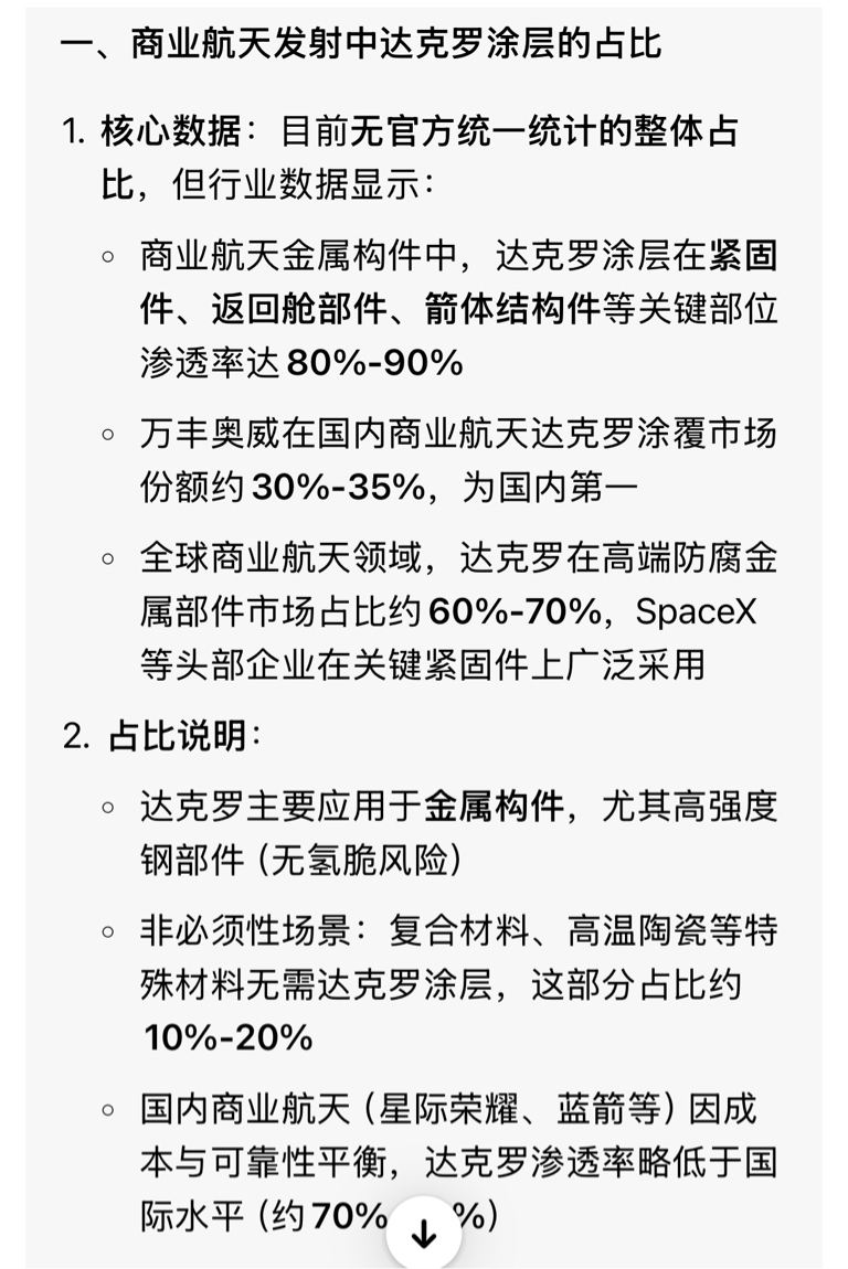 确实有这么回事达克罗涂层商业航天75%以上占比如下图