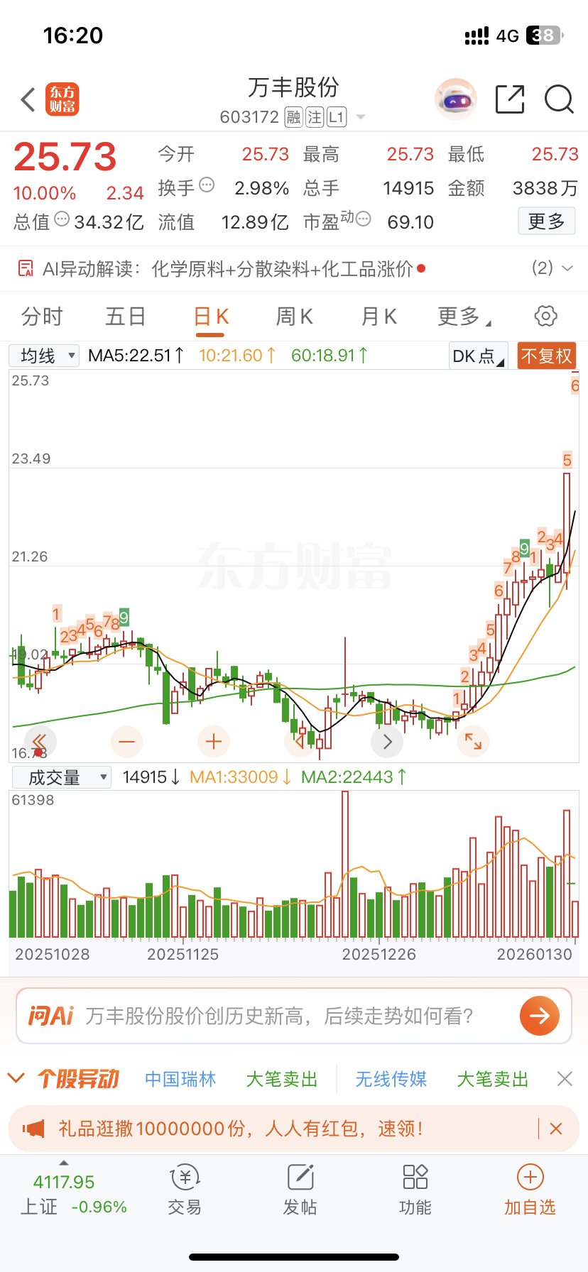 $万丰奥威(SZ002085)$ 你爹都两个涨停板了