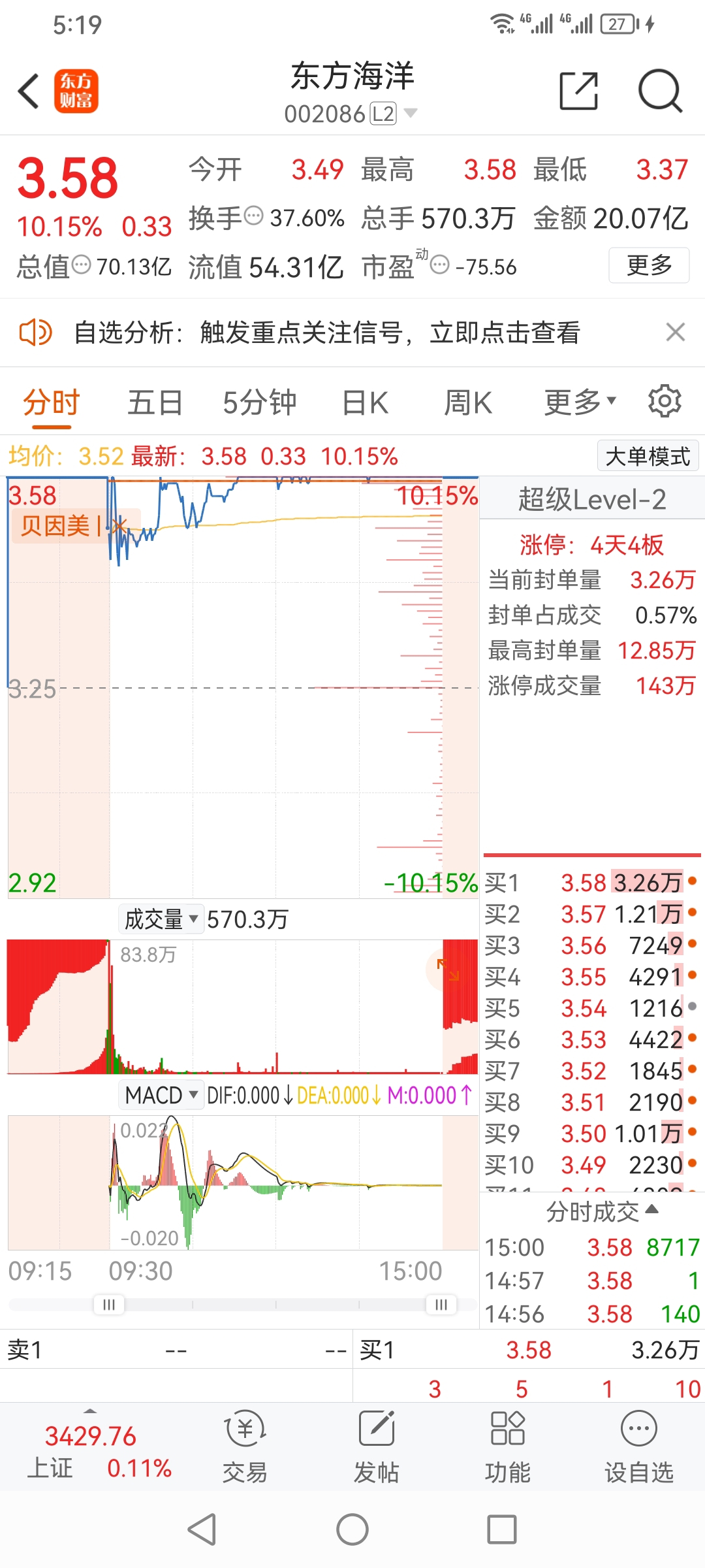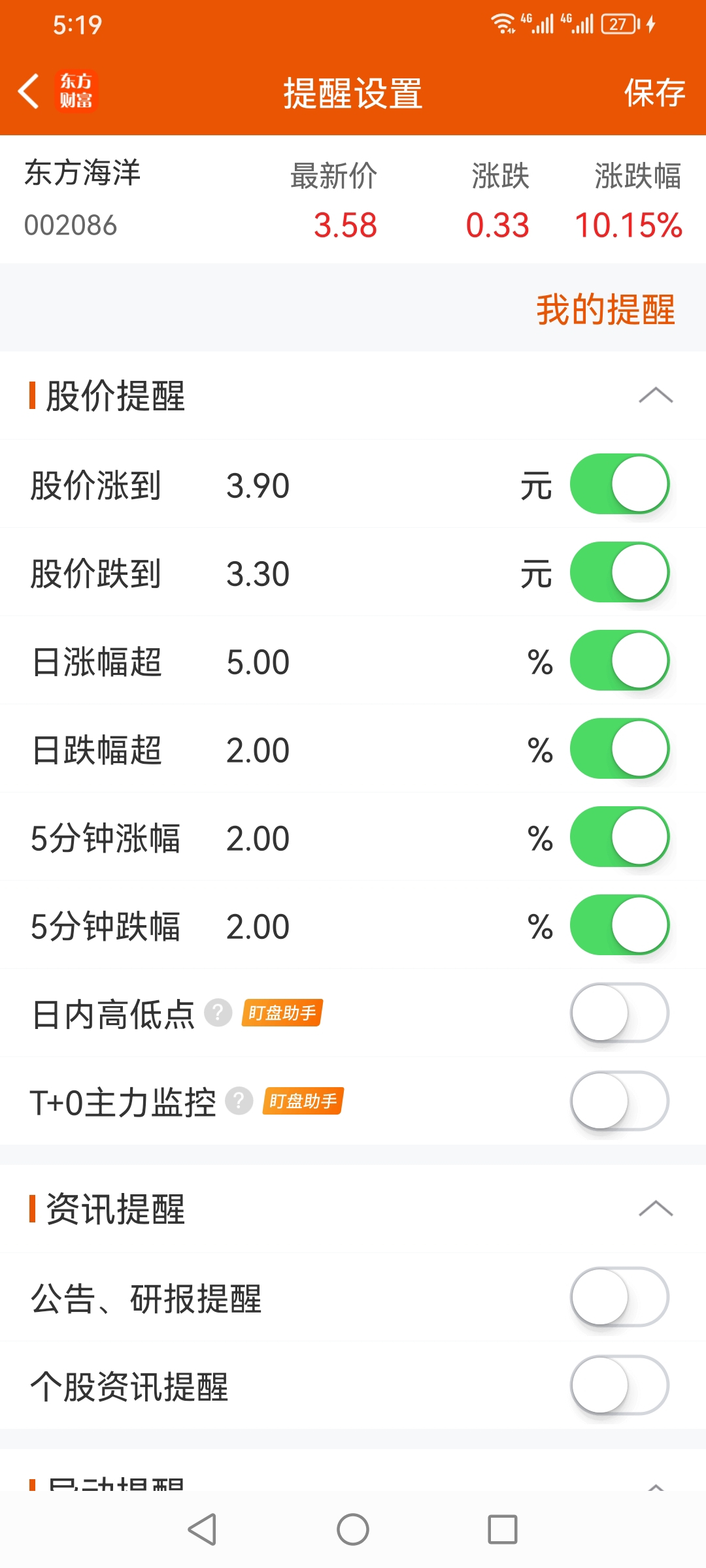 案例东方海洋 3.58元设置,高3.9元,地3.3元,上涨5%提醒。